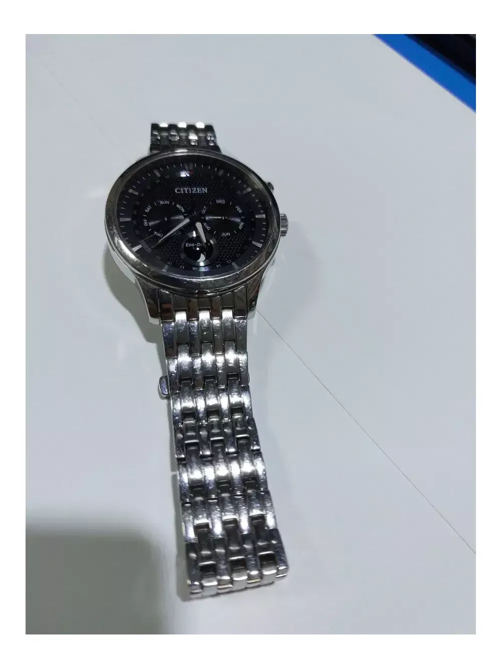 시티즌 문페이즈 검판 에코드라이브 모든 빛으로 충전됩니다. 밴드길이 대략 17.5~18cm정도. 유리 깨끗함. 밴드 생활기스있음. 시계단품. 작동 정상.