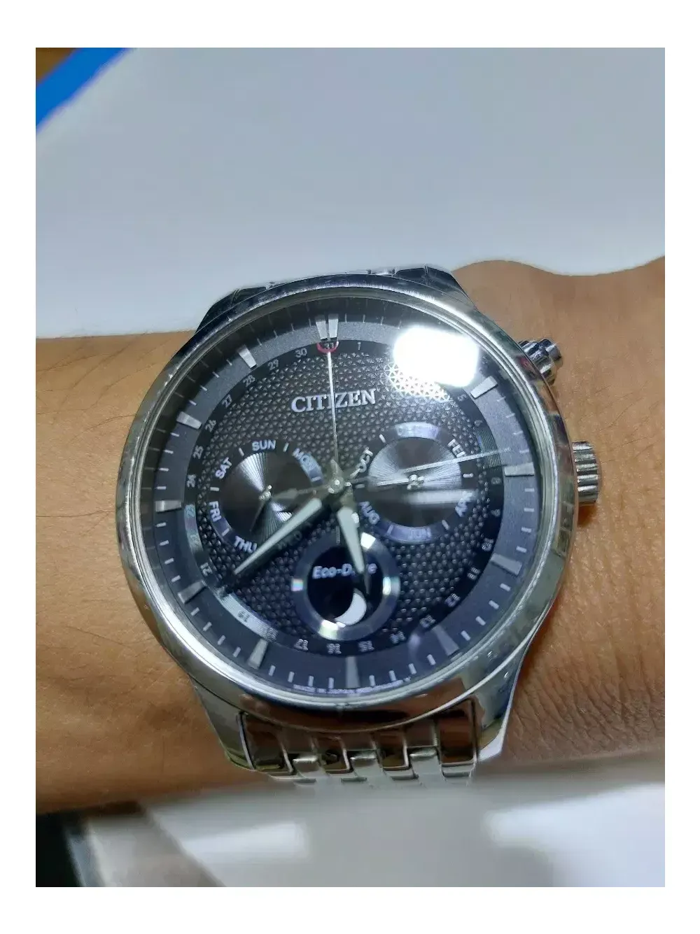 시티즌 문페이즈 검판 에코드라이브 모든 빛으로 충전됩니다. 밴드길이 대략 17.5~18cm정도. 유리 깨끗함. 밴드 생활기스있음. 시계단품. 작동 정상.