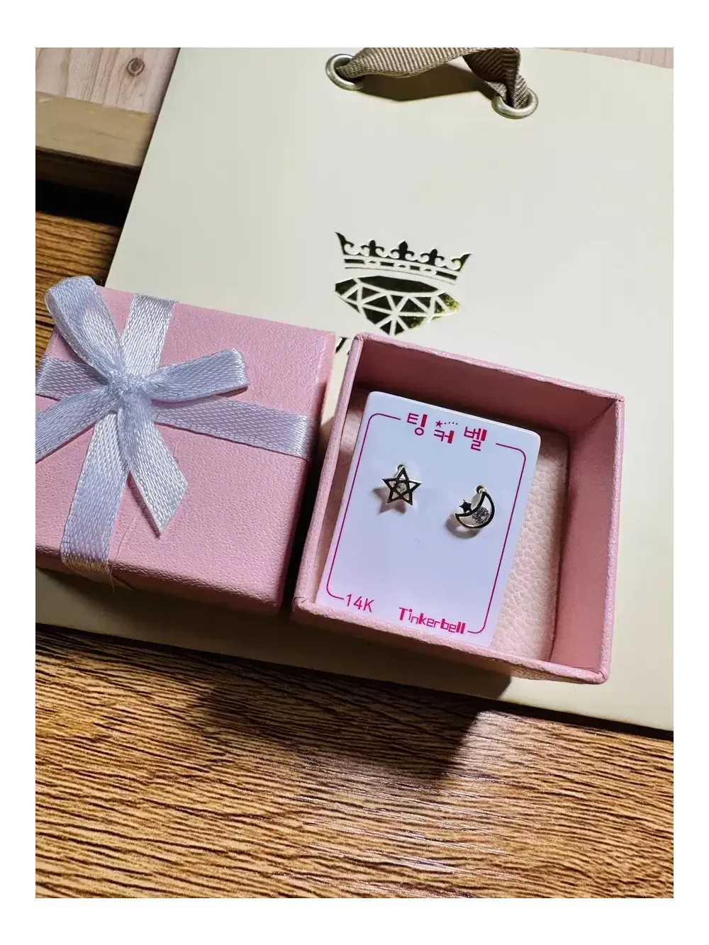 팅커벨 14K 별/달 귀걸이 미착용 새상품입니다! 선물상자,쇼핑백이 있어서 선물하시기에 좋아요~ 중고거래이니 미리 확인하시고, 환불 불가합니다~