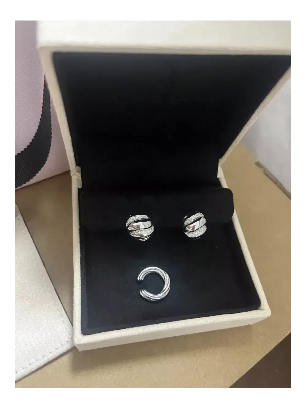 디디에두보 셀렉시옹 디 실버 귀걸이+귀찌입니다. 고급스럽구 예뻐요~ 사진 더 원하시면 보내드릴게용! 쇼핑백은 있는데 빛받아서 컬러가 다 빠졌는데 원하시면 같이 보내드려용:)