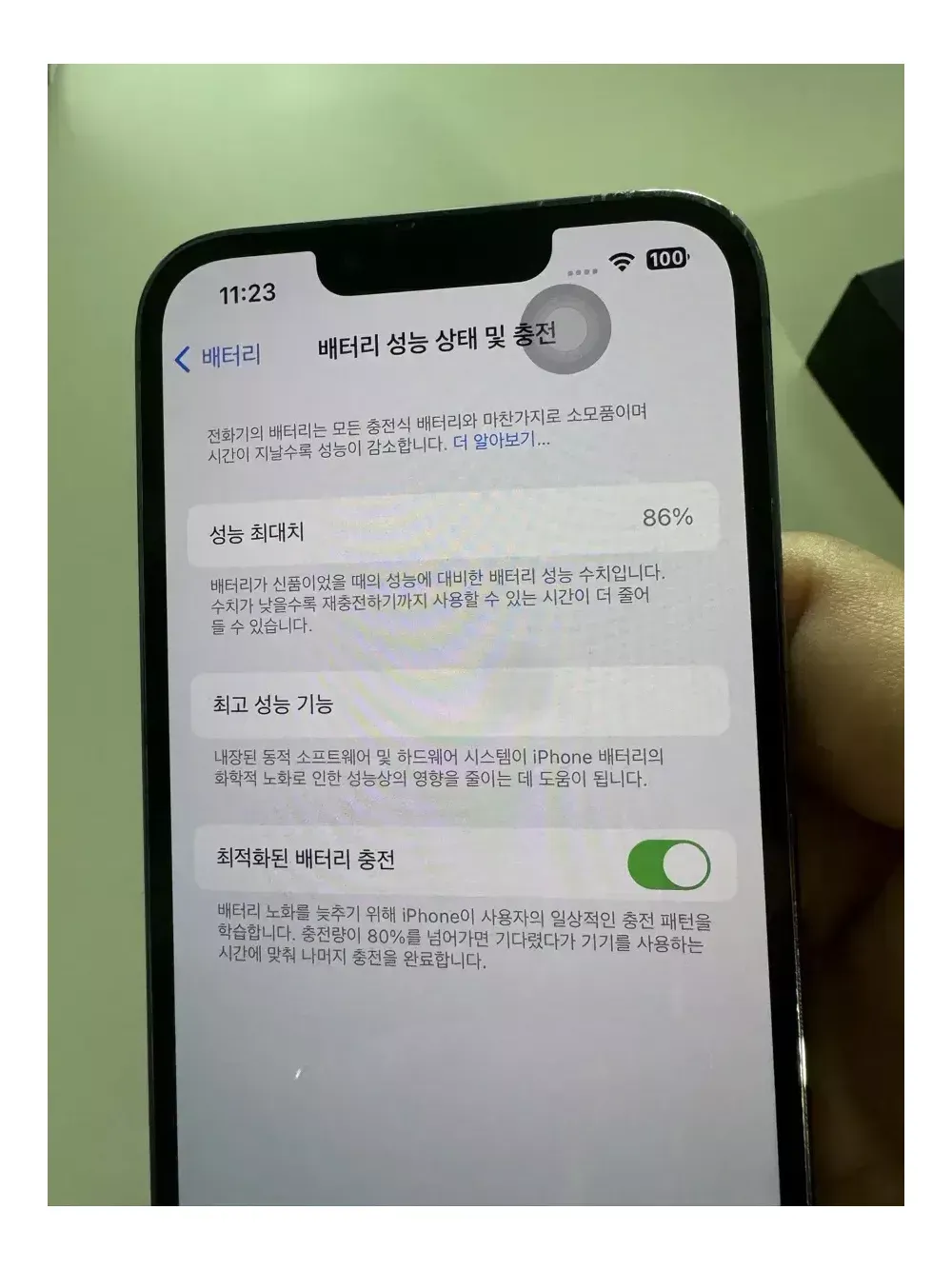 테두리 찍힘(상단 부분), 액정 생활기스 잘 안보이는 수준, 카메라 테두리 기스 있어요 배터리 성능 86% 찍힘부분 케이스 씌우면 아에 안보입니다 네고 안받아요