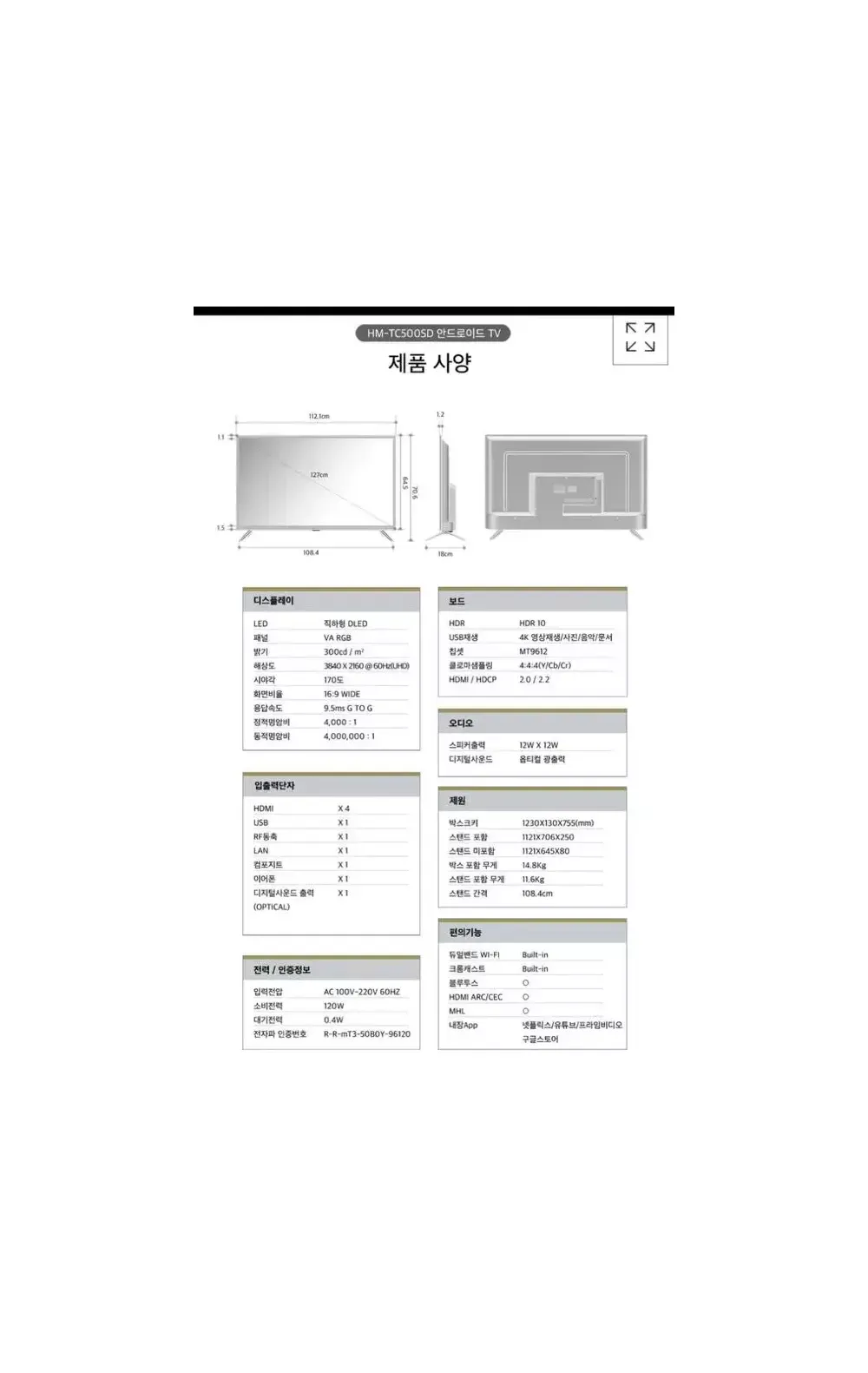 50인치 TV판매(HM-TC500SD) 넷플릭스, 유튜브 호환 요약정보 및 구매