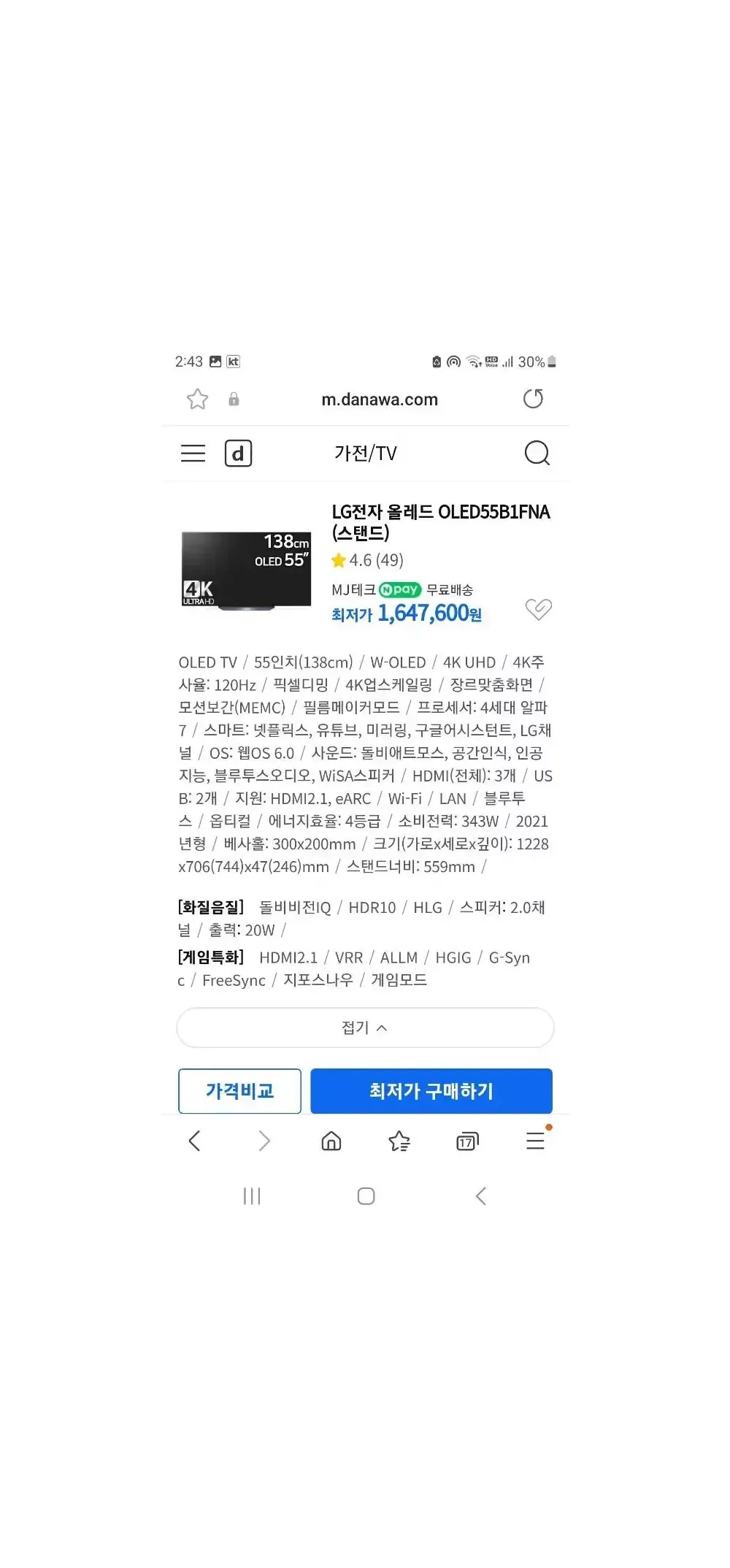 LG 55인치 올레드 4K 120Hz OLED 스마트 TV 요약정보 및 구매